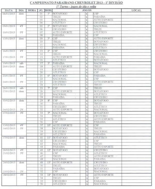A tabela e regulamento do Campeonato Paraibano de 2013 foram divulgados nesta segunda-feira pelo departamento técnico da Federação Paraibana de Futebol que tem como diretor, Geraldo Magela, ex-presidente da Federação Paraibana de Futsal.