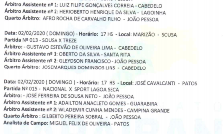 Ceaf/PB divulga os árbitros centrais que irão trabalhar na 3a rodada do Paraibano. Sousa x Treze – Árbitro, Gustavo Estêvão. Csp x...