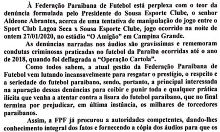 A presidente da Federação Paraibana de Futebol, Michelle Ramalho divulgou nota, nesta terça-feira, se dizendo perplexa com o teor da denúncia formulada...