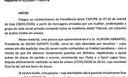 Para conhecimento dos desportistas, despacho proferido nesta terça-feira, instaurando inquérito no TJDF para apurar denúncias de manipulação de resultados no Campeonato Paraibano...