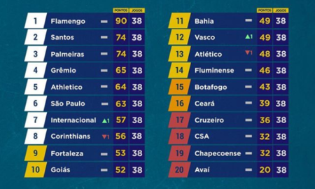 Jogos encerrados pela 38a rodada da Serie A do Campeonato Brasileiro. Cruzeiro 0x2 Palmeiras Botafogo 1×1 Ceará Corinthians 1×2 Fluminense Santos 4×0...