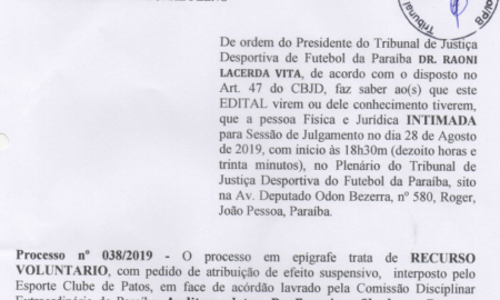A primeira reunião do novo Tribunal de Justiça Desportiva de Futebol da Paraíba será para julgar recurso imposto pelo Esporte de Patos....