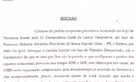 O presidente do Sousa, Aldeone Abrantes, foi suspenso pelo Superior Tribunal de Justiça Desportiva por 30 dias. O fato está relacionado com...