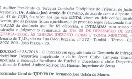 Será julgado no próximo dia 5, pela Terceira Comissão Disciplinar do Tribunal de Justiça Desportiva de Futebol da Paraíba, o recurso impetrado...