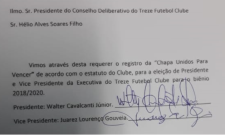 A chapa para diretoria executiva do Treze já está definida. Os noves de Walter Cavalcante Júnior, como presidente, e de Juarez Lourenço Gouveia, na...