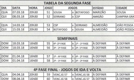 Divulgadas as tabelas da segunda fase e semifinal do Campeonato Paraibano de 2018 e do Torneio da Morte. Sousa x Botafogo jogam...