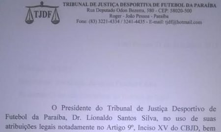 O presidente do Tribunal de Justiça Desportiva de Futebol da Paraíba, Lionaldo Santos, comunicou através de oficial que o órgão entra em recesso...