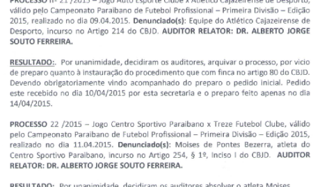 A Segunda Comissão Disciplinar do Tribunal de Justiça Desportiva da Paraíba determinou o arquivamento do processo 21/15 que tinha o Atlético de...