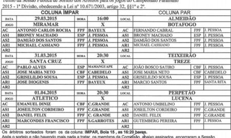 Antonio Carlos Rocha apita Botafogo e Miramar, neste domingo, pela décima rodada do Campeonato Paraibano de 2015. Foram definidos ainda os árbitros...