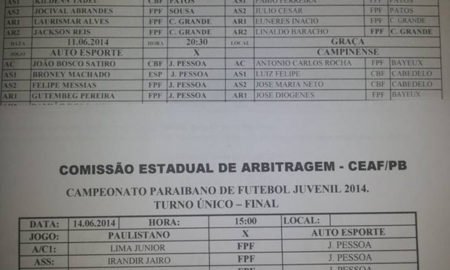 Arbitragem na rodada de quarta-feira. Treze x CSP no PV, às 20h30. Árbitro central – Renan Roberto, de JP, auxiliado por Kilden...