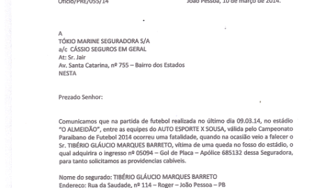 O departamento jurídico da Federação Paraibana de Futebol encaminhou informações a Tókio Marine Seguradora sobre a morte do torcedor do Auto Esporte,...