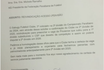 A Federação Paraibana de Futebol, após recebe a solicitação do Sabugy, vai analisar a documentação e em seguida promete se pronunciar. A...