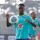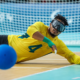 Leomon cai para o lado esquerdo à espera do contato com a bola, que quica à sua frente. Ele veste camisa amarela...