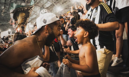 Imagem capturada de pai e filho comemorando gol na Arena MRV Paixão em Preto & Branco A fotografia que registra a explosão...