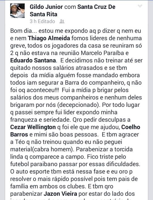 Através da sua conta pessoal no Facebook, o volante Gildo Junior, ex-Santa Cruz, disse que esta triste pela situação que passa o Futebol Paraibano (atraso de salários), e deixa uma critica ao técnico Mirandinha Silva, quando elogia a atitude do Técnico Jazon Vieira, que ficou ao lado de seus atletas, por causa de salários atrasados também no Auto Esporte.