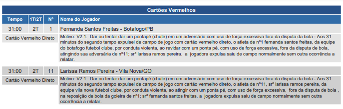 A atleta do Vila Nova, Larissa, também recebeu cartão vermelho no mesmo lance. Larissa atingiu a goleira do Botafogo, em uma jogada de reposição de bola, como explica o árbitro da partida no relatório.