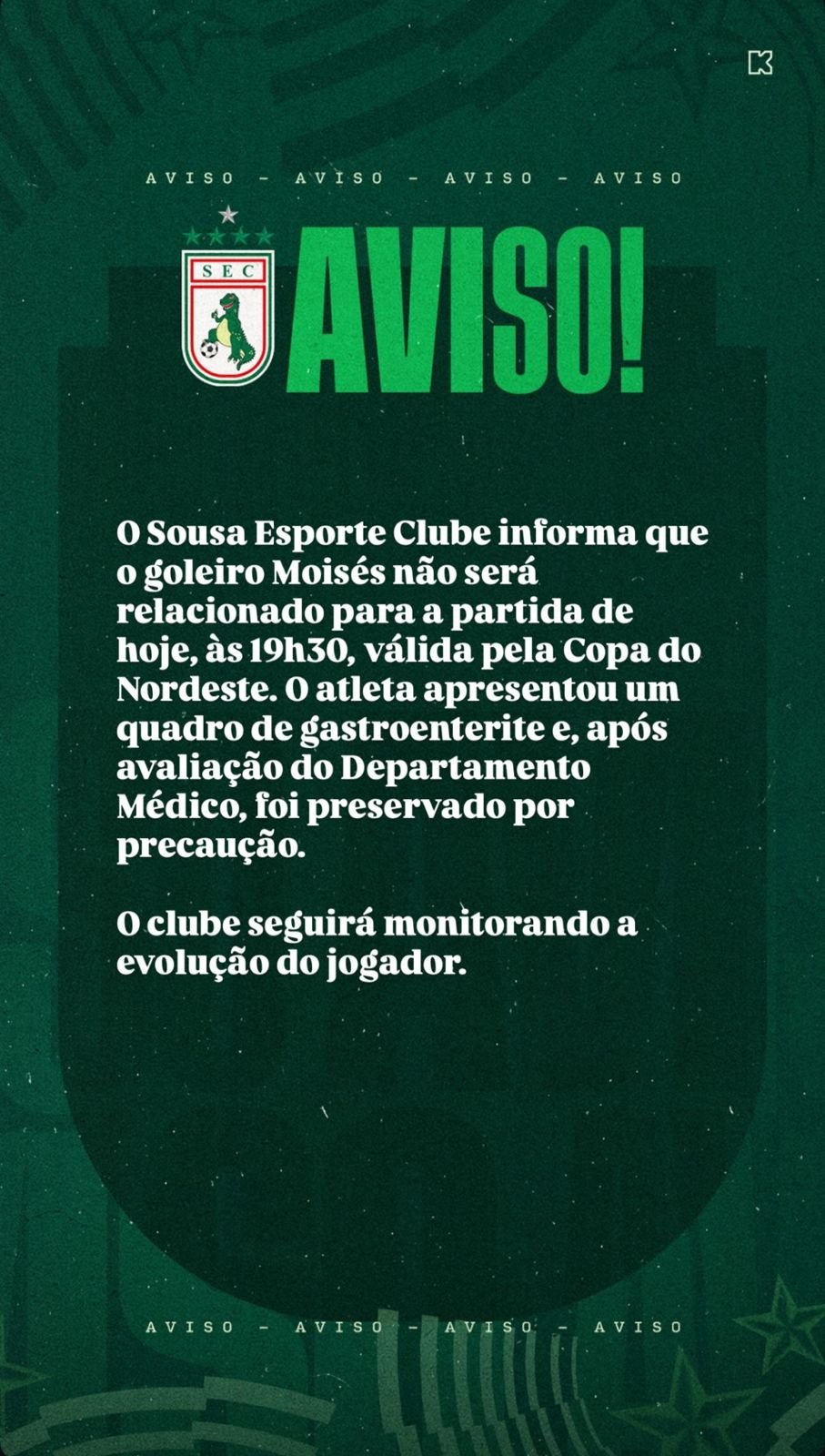 O goleiro Sousa, Moisés, não atua pelo Sousa na partida desta quarta-feira (15), às 19h30, contra a Juazeirense-BA, pela Copa do Nordeste.