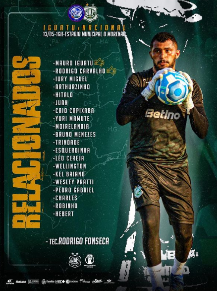 O Nacional de Patos entra em campo, neste sábado (13), para encarar o Iguatu-CE, pela segunda rodada do Campeonato Brasileiro da Série D, no estádio Morenão. O treinador Rodrigo Fonseca relacional 22 jogadores para este compromisso.