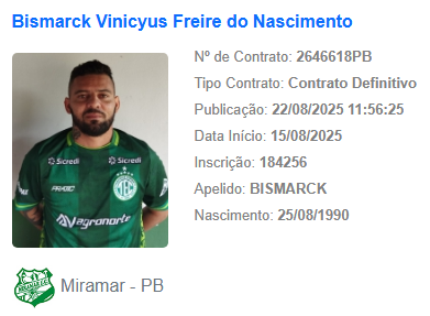 O meia Bismarck, 34 anos, é a atração do Miramar de Cabedelo. Parnahyba, Independente Tucuruí, Tocantinópolis, Parnahyba-PI, Fluminense-PI, Campinense, Juazeirense-BA, Floresta-CE, CSA, Aparecidense, Botafogo-PB e Treze.