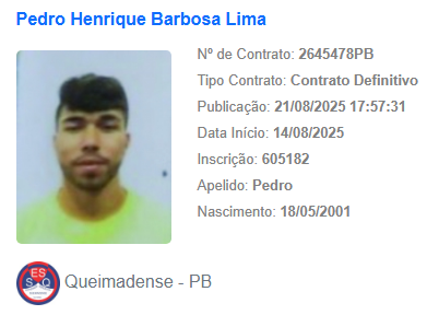 O atacante Pedro Chinês, 24 anos, é a esperança de gols no time da Queimadense. O jogador, revelado pelo Campinense, teve passagem por clubes como Baraúnas-RN, Esporte de Patos e Perilima.