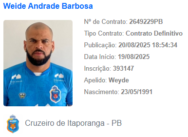 O goleiro Andrade, 33 anos, acertou contrato com o Cruzeiro de Itaporanga. Ex-goleiro do Treze, nas últimas duas temporadas, o arqueiro Andrade acumula passagens por clubes tradicionais do futebol brasileiro: como Goiatuba-GO, Central-PE, Fluminense de Feira-BA e Altos-PI.