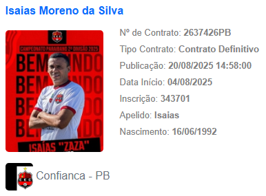 O atacante Isaías, 32 anos, com passagem por vários clubes da Paraíba, Auto Esporte, São Paulo Crystal, vai vestir a camisa do Confiança de Sapé.