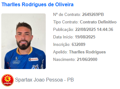 O jogador Tharlles Rodrigues de Oliveira, 25 anos, vai defender o Spartax. O último time dele foi Humaitá-AC, Grêmio de Esportes Maringá-PR, Santa Cruz-PE, CSP e Queimadense.