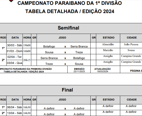 A Federação Paraibana de Futebol através do departamento técnico definiu as datas da fase semifinal e da grande final do Campeonato Paraibano da Primeira Divisão. Os jogos de ida da fase seminal vão acontecer nos dias 30 e 31. As partidas da volta serão disputadas nos dias 2 e 3 de abril.