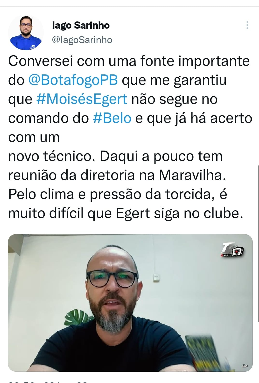 O jornalista Iago Sarinho, setorista do Botafogo-PB para a Rádio Tabajara, onde Sarinho comanda a equipe esportiva, tem como certa a queda do treinador botafoguense, Moisés Egert. Segundo apurou Sarinho, junto a um fonte do clube, “que Egert não segue no comando do Botafogo”.