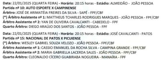 Com dois jogos atrasados, o Campeonato Paraibano da Primeira Divisão de 2025 prossegue para esta quarta-feira (22). O Auto Esporte recebe o Campinense e o Nacional de Patos encara a Picuiense. Definida a arbitragem para as duas partidas.