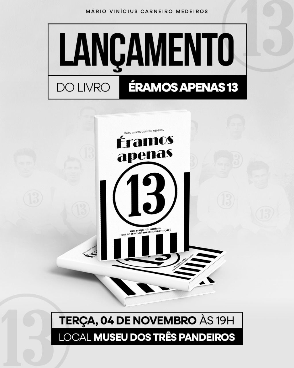 Nesta terça-feira (4), às 19h, o Museu dos Três Pandeiros será palco do lançamento do livro “Éramos apenas 13”, de autoria do professor Mário Vinícius. A obra é um tributo aos treze homens que, em 1925, se reuniram para fundar o Treze Futebol Clube, e promete oferecer à torcida alvinegra uma viagem pelas origens do Galo da Borborema.