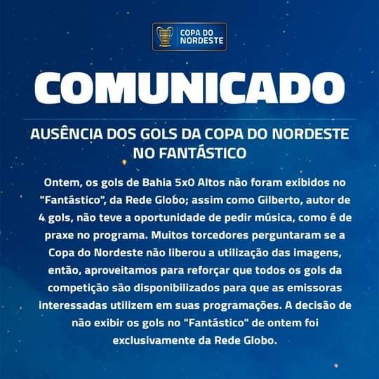O futebol, segundo filósofos, intelectuais e estudiosos, é um meio de unir povos, em todos os seguimentos sociais. Mas, no Brasil, especialmente, na região do Nordeste, isso não acontece. A prova disso, é que, a Liga Nordeste que organiza o maior campeonato da região, divulgou por não exibição de gols. Uma emissora de tradição nacional se recusou a exibir os gols do Bahia que, que venceu o Altos, por 5 a 1. Além disso, o artilheiro Gilberto marcou quatro gols no jogo.