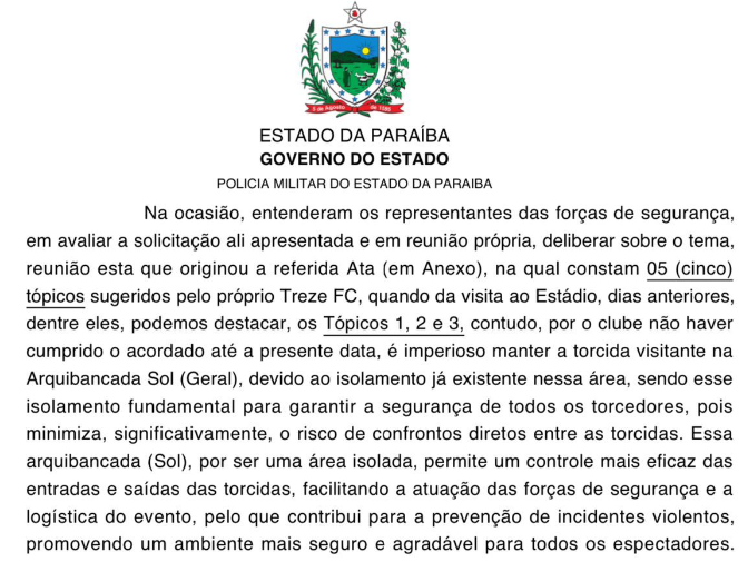 É uma irresponsabilidade. Com você, torcedor que vai a campo, e por conta desta mesma decisão inconsequente, sofreu desnecessariamente na semifinal do paraibano. Com o clube, que não tem apoio, mas sofre retaliação do Poder Público. Com a cidade, que vê um grande evento ser sabotado por quem devia zelar pela população.