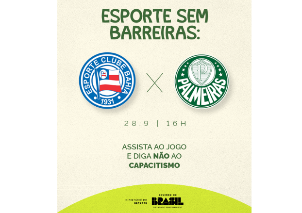 O Ministério do Esporte, por meio da Secretaria Nacional do Paradesporto, promove neste domingo (28), com apoio do Governo do Estado da Bahia, uma ação especial do Setembro Verde, mês de mobilização nacional contra o capacitismo. A iniciativa acontece na Arena Fonte Nova, em Salvador, durante a partida entre Bahia e Palmeiras pelo Campeonato Brasileiro Série A.