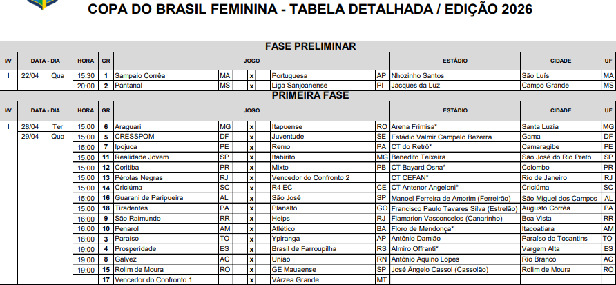 A CBF publicou na noite desta segunda-feira (30) a tabela detalhada referente à primeira fase da Copa do Brasil Feminina 2026. Este estágio da competição começará em 28 de abril e terá 16 confrontos. O Mixto, representante da Paraíba, joga contra o Coritiba no próximo dia 29 pela Copa do Brasil de Futebol Feminino 2029