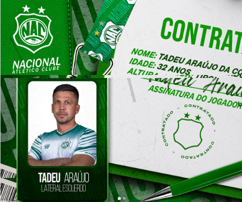 O lateral-esquerdo Tadeu Araújo é o novo reforço do Nacional de Patos. Com passagens por clubes como Tirol, Caucaia e Murici-AL, o atleta chega ao Verdão Maravilha trazendo experiência, velocidade e muita disposição para defender as cores do Naça nesta temporada.