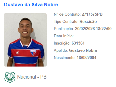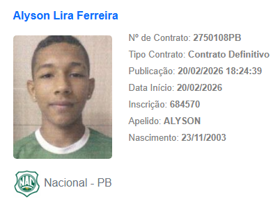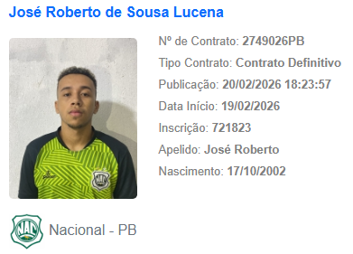 O Nacional de Patos regularizou dois jogadores junto ao BID da CBF nesta sexta-feira (20). Alyson e José Roberto podem atuar no próximo compromisso do Canário, contra o Treze, domingo (22), no estádio Amigão, em Campina Grande, pelo Campeonato Paraibano da Primeira Divisão de 2026. Mas na mesma página saiu o nome de Roberto Nobre, mais um atleta dispensado pelo clube nacionalino.