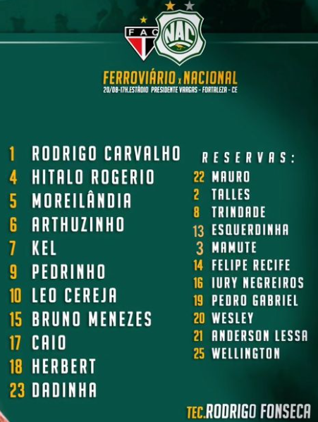 O Nacional de Patos e Ferroviário-CE, entrando em campo neste domingo (20), às 17h, no estádio Presidente Vargas, na cidade de Fortaleza-CE, pela terceira fase do campeonato Brasileiro da Série de 2023. Com vitória do Ferroviário.