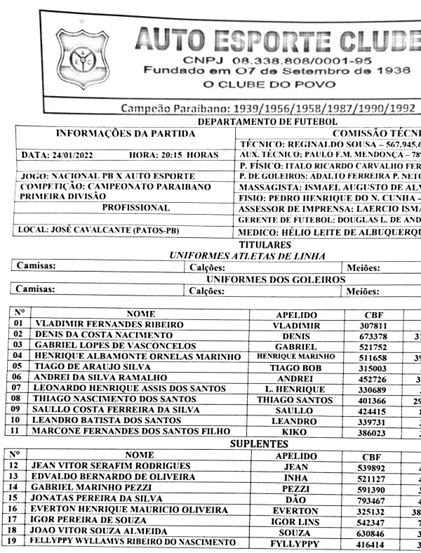 Nacional de Patos e Auto Esporte atuaram no estádio José Cavalcanti, em Patos, pela quinta rodada do Campeonato Paraibano da Primeira Divisão de 2023, com vitória do time da casa por 2 a 1. Nacional de Patos 2×1 Auto Esporte, gols de Dentinho e Doda (N) e Henrique (A)