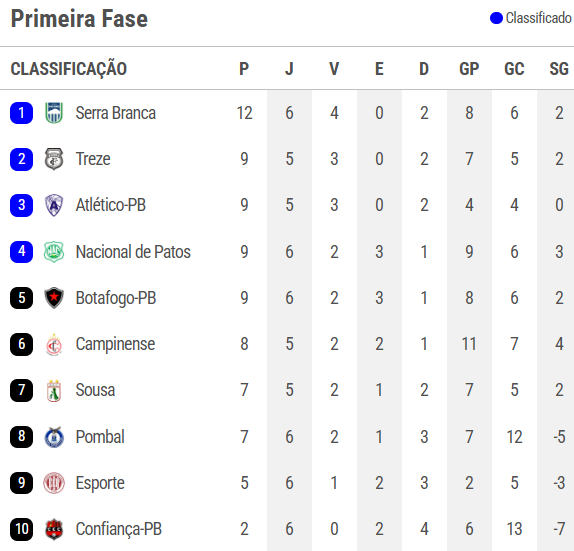 Nacional de Patos 0x0 Botafogo-PB, nesta quinta-feira (5), no estádio José Cavalcanti, às 20h, em Patos, na sexta rodada do Campeonato Paraibano da Primeira Divisão de 2026. Fim de jogo.