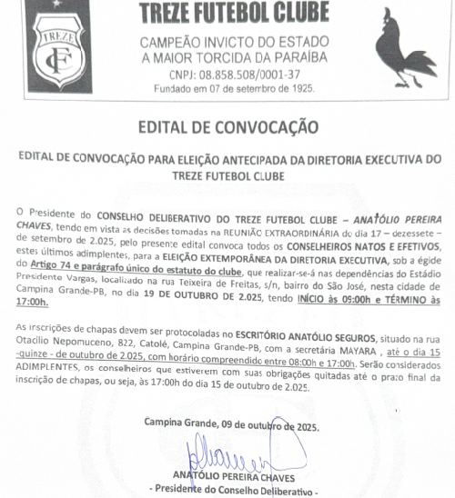 O novo edital convoca eleição do Treze para o próximo dia 19. O documento assinado pelo presidente do Conselho Deliberativo do Galo da Borborema, Anatólio Chaves, indica, ainda, o dia 15 como prazo final para inscrições de chapas.