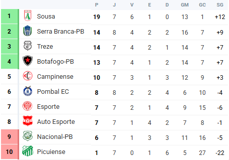 1 – Sousa soma 19 pontos e pode chegar aos 25 pontos, pois enfrenta Treze (F) e Botafogo-PB (C)