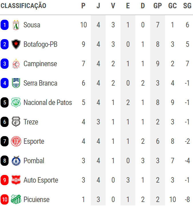 O Sousa termina a quarta rodada na liderança do Campeonato Paraibano da Primeira Divisão de 2025, com dez pontos ganhos. A competição já teve 19 partidas disputadas e 50 gols marcados. O Campinense tem melhor ataque com nove gols. A Picuiense tem a pior defesa, com dez gols sofridos.