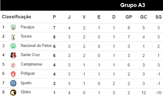 O Grupo A3 da Série D do Campeonato Brasileiro tem novo líder, depois de ficar duas rodadas nas mãos do Sousa Esporte Clube. O Pacajus-CE com a vitória de 3 a 0 sobre o Globo-RN, neste sábado, agora soma sete pontos e dorme no topo.