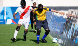 Atletas em disputa na Competição de Futebol de Cegos – Brasil X Peru no Parapan Santiago, 2023 | Foto: Miriam Jeske/CPB @miriamjeske_...
