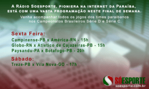 A Rádio Soesporte a primeira na Paraíba a comunicar através da internet tem uma vasta programação nesta final de semana. Vamos acompanhar...
