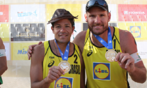 O Brasil dominou o pódio masculino da etapa quatro estrelas de Espinho (Portugal), válida pelo Circuito Mundial de vôlei de praia 2019....