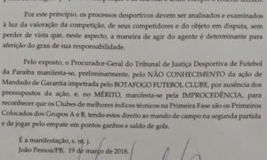 O Tribunal de Justiça Desportiva de Futebol da Paraíba julgou improcedente, por 8 a 0, a ação do Botafogo que pedia jogar...