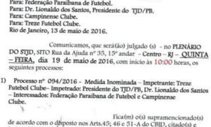 O edital divulgado pelo Superior Tribunal de Justiça Desportiva anuncia o presidente do Tribunal de Justiça Desportiva da Federação Paraibana de Futebol,...