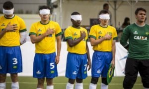 Futebol de 5 é disputado por atletas com deficiência visual. Apenas o goleiro tem visão total. O time do Brasil tem os...